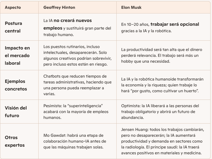 La primera la defiende Geoffrey Hinton Científico informático y psicólogo cognitivo, considerado uno de los padres de la inteligencia artificial por su trabajo en redes neuronales y deep learning. Premio Nobel de Física. Ex trabajador de Google, ahora dedicado a advertir sobre los riesgos de la IA. La segunda del Elon Musk, el empresario y CEO de Tesla, defiende que los avances tecnológicos permitirán eliminar el trabajo tradicional en 10 a 20 años.